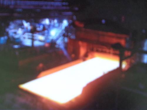 途中の工場で下車し、工場内2階の通路を歩いて見学しました。厚さ25㎝・長さ約30mの真っ赤に熱せられた鉄板が、プレス機で厚さ2mm・長さ800m~900mに延ばされ、筒状に巻かれる工程を見たときは、50m先をコンベアーで流れてくる真っ赤な鉄板が通るだけで、かなりの熱さを感じました。
