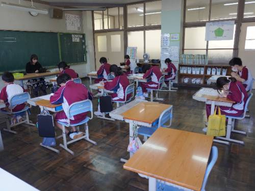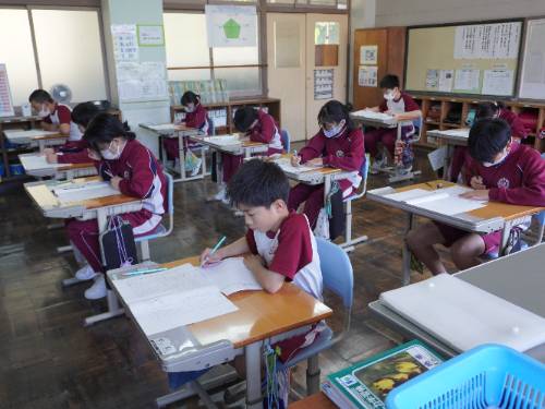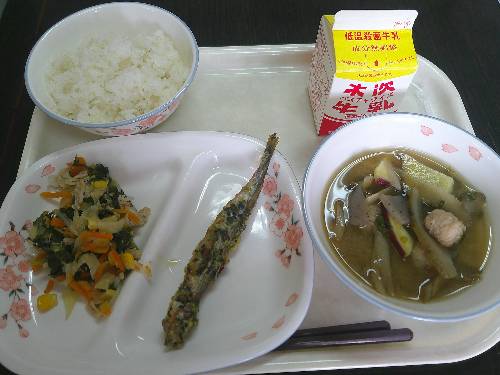すばらしい天気に恵まれたこの日、愛育学級の2人は畑の草取りをしました。担任の先生と校務技師・地域コーディネーターの3人の先生たちにも手伝ってもらいました。