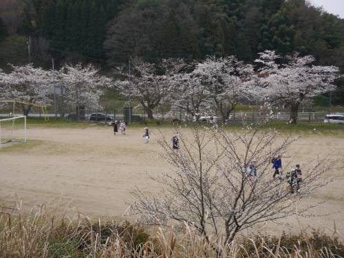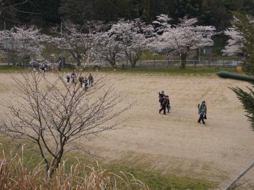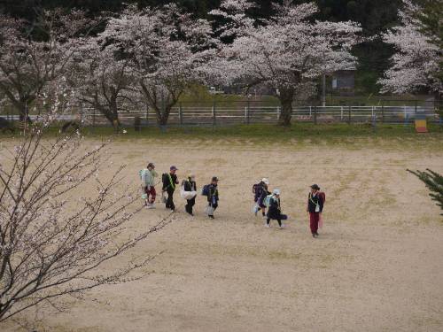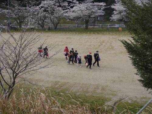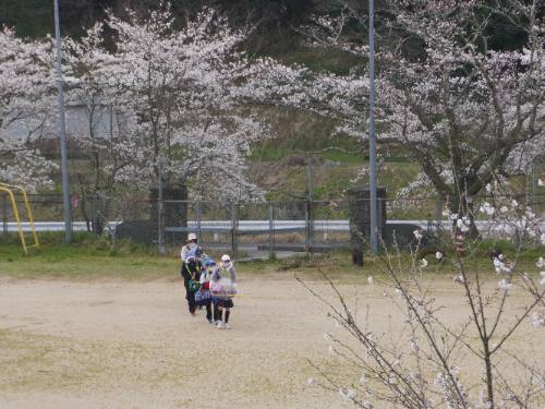 初日の集団登校、、、 桜の咲く校庭を元気よく歩いて登校してきました(^^♪