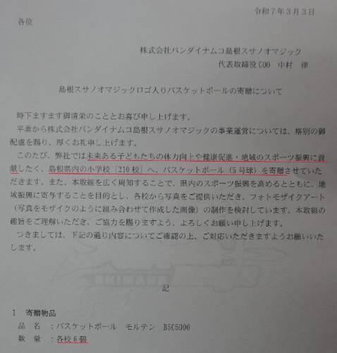 先日、プロバスケットボールチームの『島根スサノオマジック』さんから「バスケットボール」を6個いただきました。
