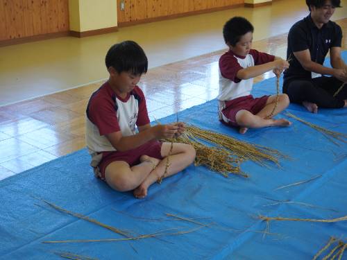 この日、稲刈りの時に刈った稲を結ぶときに使う「よりない」づくりを行いました。