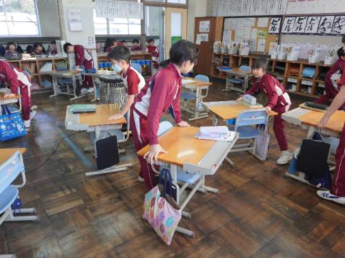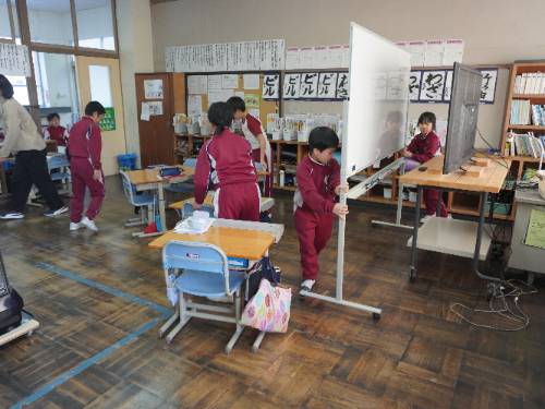 机を移動して、教室の前側を3年生が、後ろ側を4年生が授業できるように自分たちでてきぱきと配置していきます。