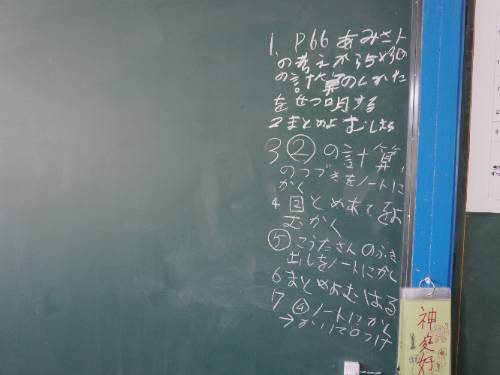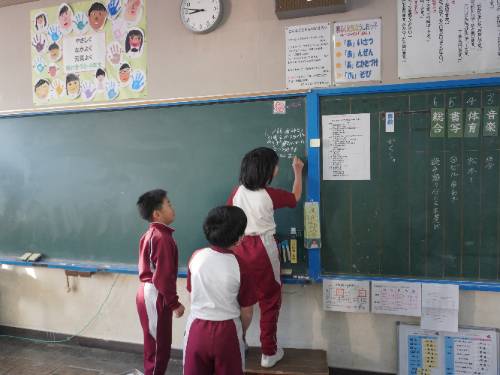 そして、「今日の授業の流れ」をそれぞれの黒板(ホワイトボード)の右端に担当の児童が記入して準備完了です。