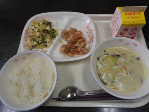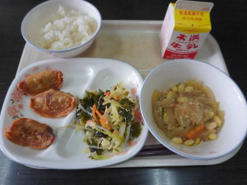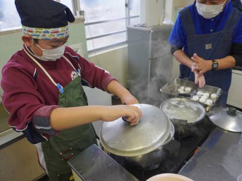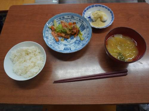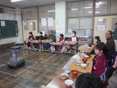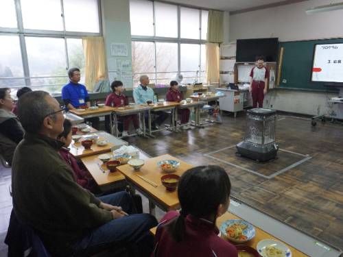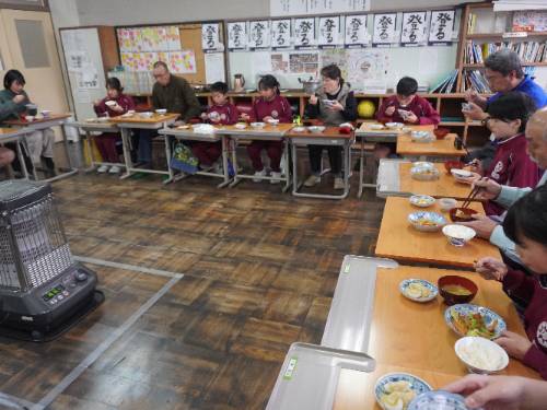 まずは教室で、みんなでの食事会です。自分たちで作ったお米、そして自分たちで調理した野菜炒め、みそ汁で歓迎会食です。