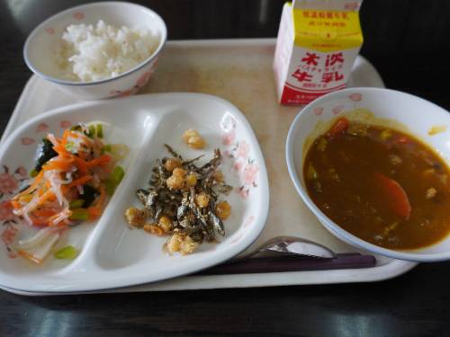 今日はみんなが楽しみにしていたカレーの日、「秋たっぷりのカレーライス」でした。さつまいも、しめじ、かぼちゃなど季節の野菜が具だくさんでした\(^o^)/