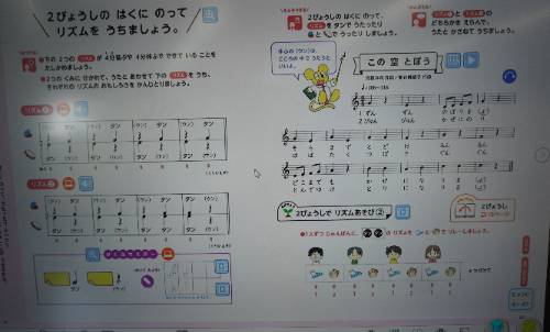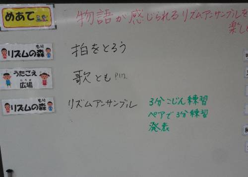 2年生の音楽、「2びょうしの はくに のって リズムを うちましょう」というめあてで取り組んでいました。