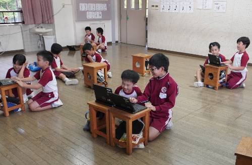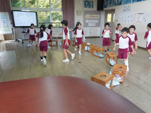 最初に、ピアノの調子に合わせて教室の中を自由に歩き、ちょうどピアノの曲が終わるタイミングで自分の椅子に座るという活動をしていました。速いテンポ、ゆっくりのテンポなどいろいろなパターンでの曲に合わせて、中にはジェスチャー付きで楽しそうに歩いている子もいました。