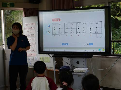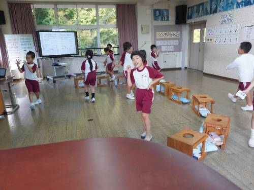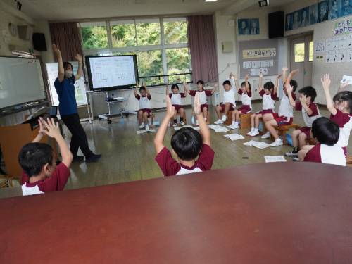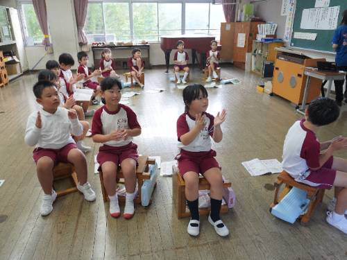その後、「2拍子の拍にのって、リズム打ちをする」というテーマに取り組んでいました。指名された二人の児童が決めた「1拍目が頭の上で手を合わせ、2拍目は右足を踏み鳴らす」というのを順番にやってみました。