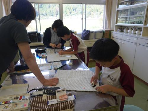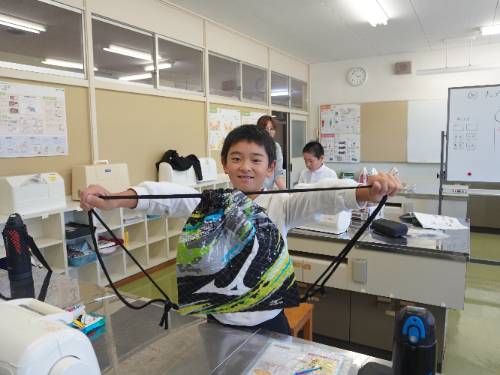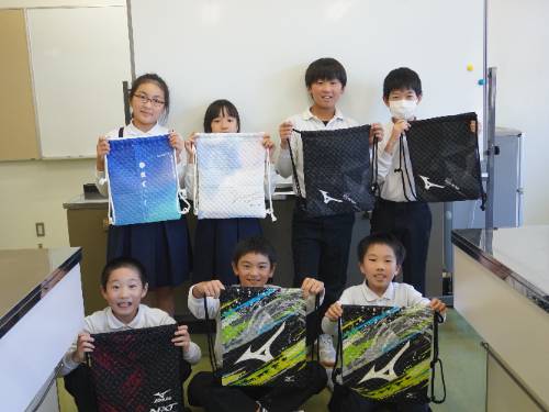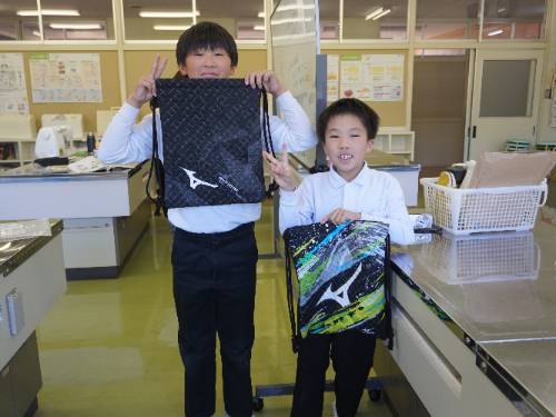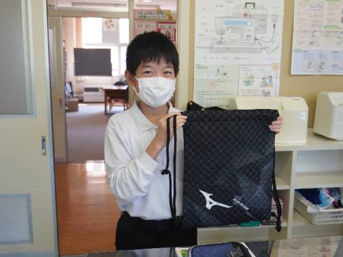 6年生、愛育学級に続いて5年生もナップザック作りに取りかかりました。