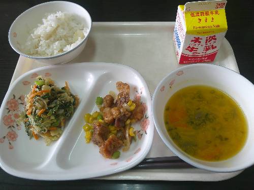 にんにくがほのかに香り、甘辛く揚げてある「豚肉のスタミナ揚げ」。枝豆の緑色、コーンの黄色も鮮やかで見た目にも楽しかったです(^^♪