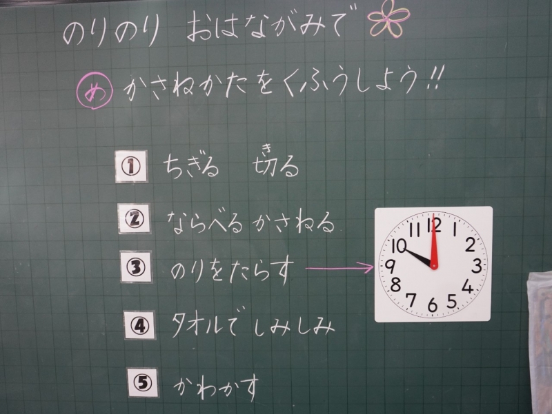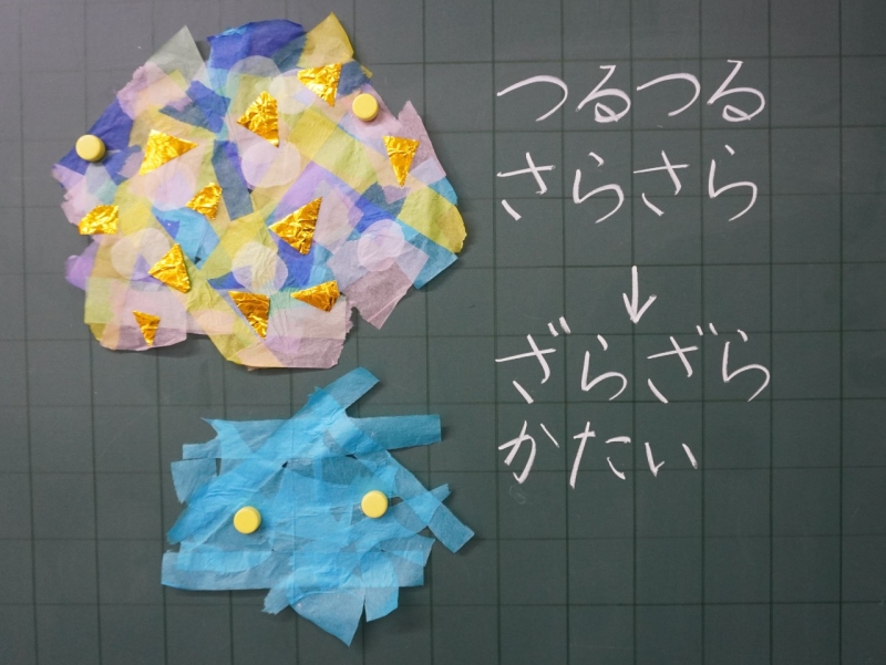 「つるつる さらさら」だったおはながみが、のりを垂らすことによって