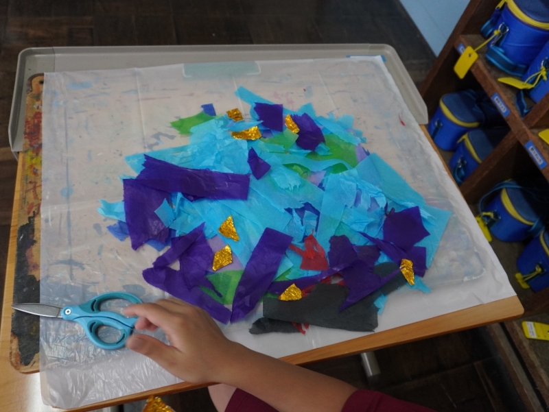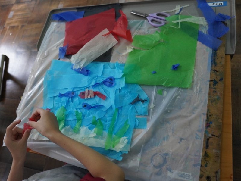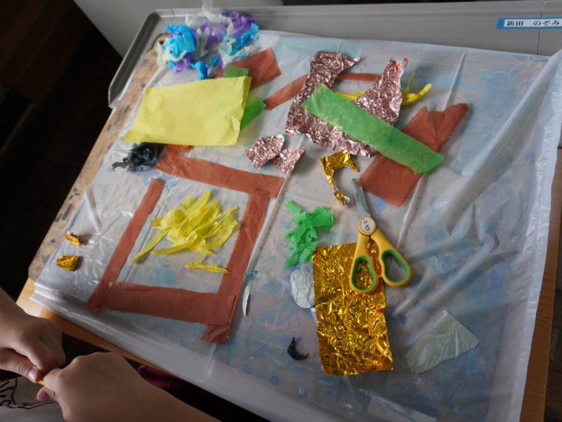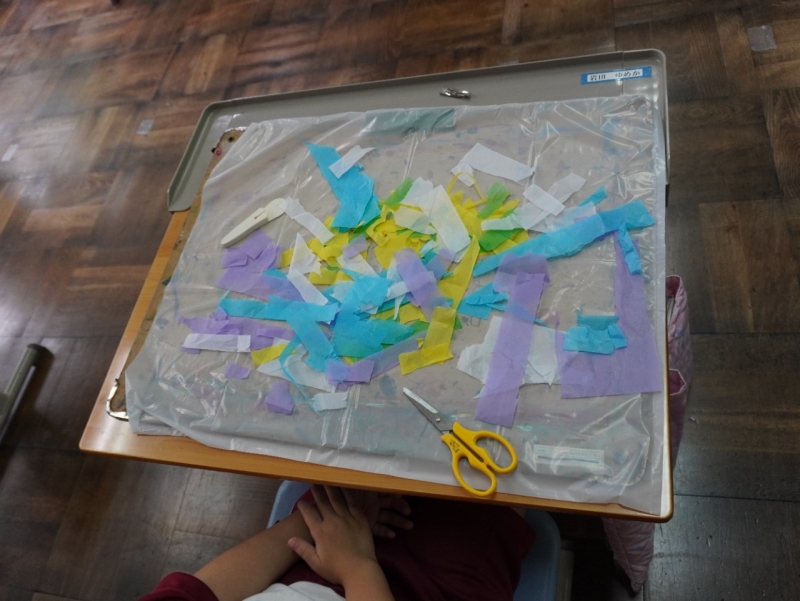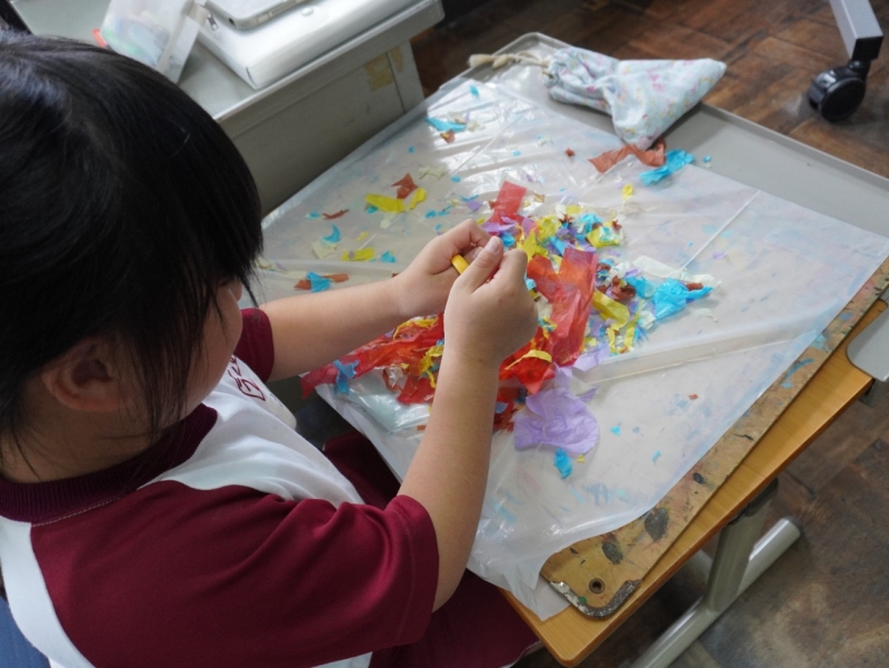 ちぎったり、切ったりしたおはながみを、自分が思うように並べたり重ねたりしたとき、