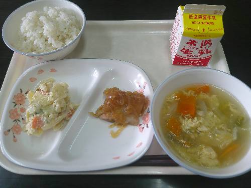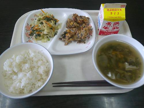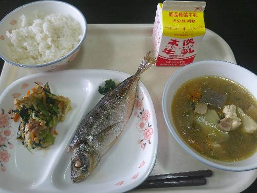 大ぶりが丸々1匹の「丸ごとアジの塩焼き」。ちょうどいい塩梅の味付けでした。小骨を取るのに苦労している子もいましたが、苦労した分、きっとおいしかったでしょう(^_-)-☆(なんと、6年生は全員が上手に食べていました!)